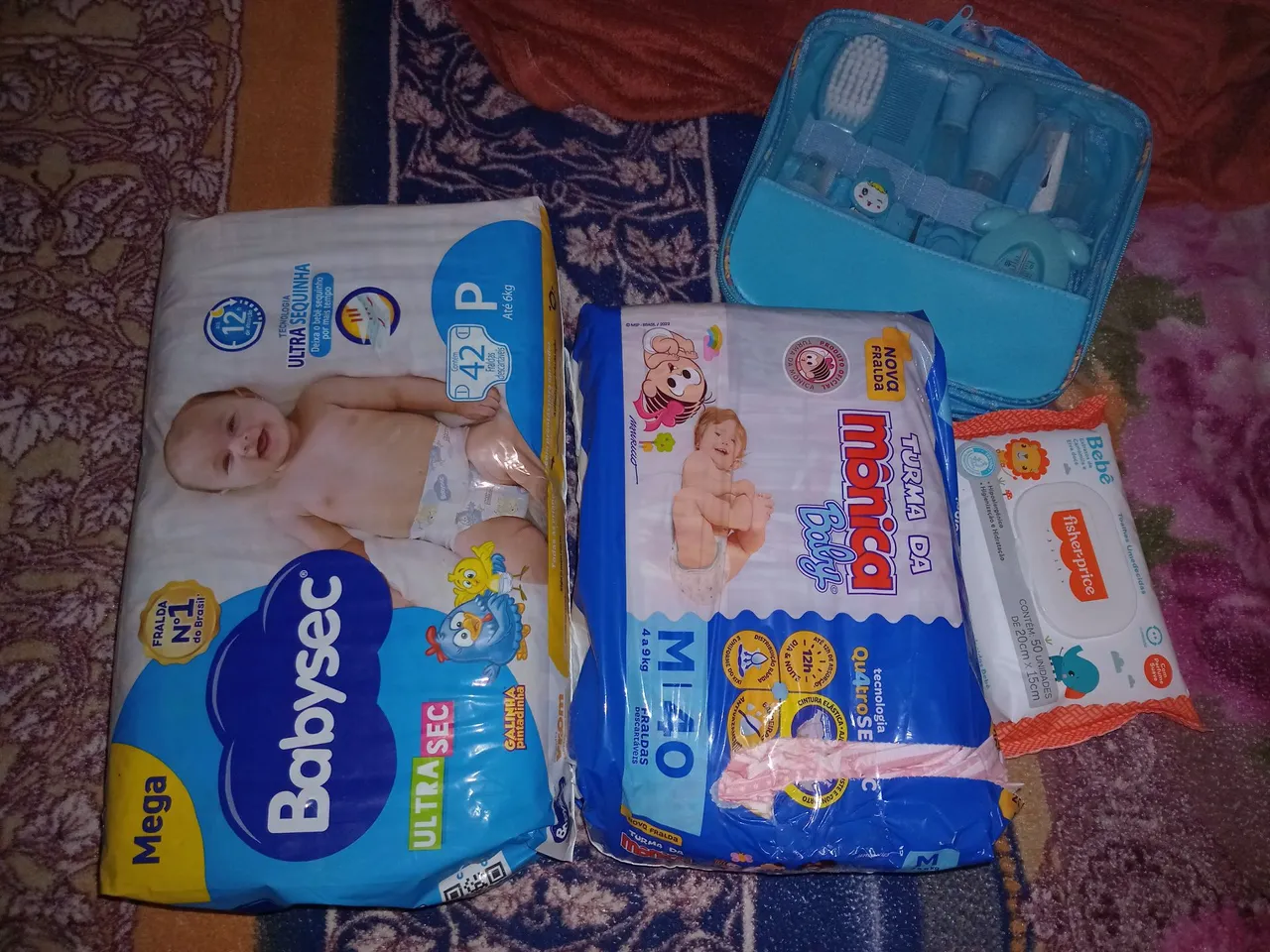 Kit de higiene para bebê completo! Inclui fraldas Babysec e Turma da Mônica, lenços umedecidos Fisher-Price e um prático kit de higiene com diversos itens essenciais para o cuidado do seu bebê.