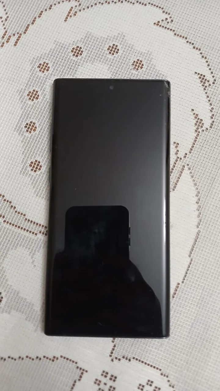 Galaxy Note 10+ 256gb com pequeno trinco na tela frontal e na capa traseira.