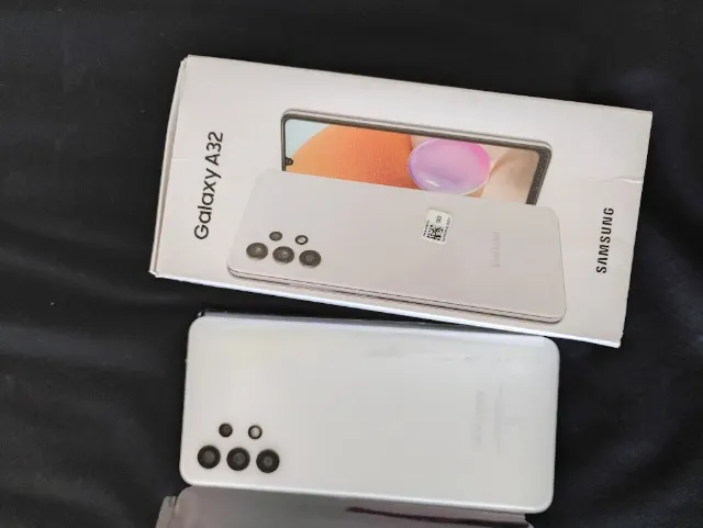 Vendo Samsung Galaxy A32, 128 GB de memória, com pequenos arranhões nas laterais e traseira. A tela frontal está em perfeito estado, original de fábrica.