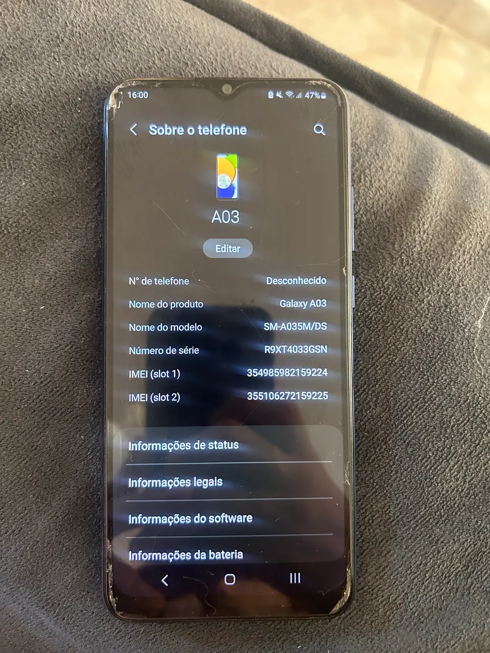 Vendo Samsung a03,em perfeitas condições apenas película trincada,funciona tudo sem defeitos,aceito ofertas,celular pra sair logo pra quem precisa de um celular mas em conta!!!! Vem nas ofertas