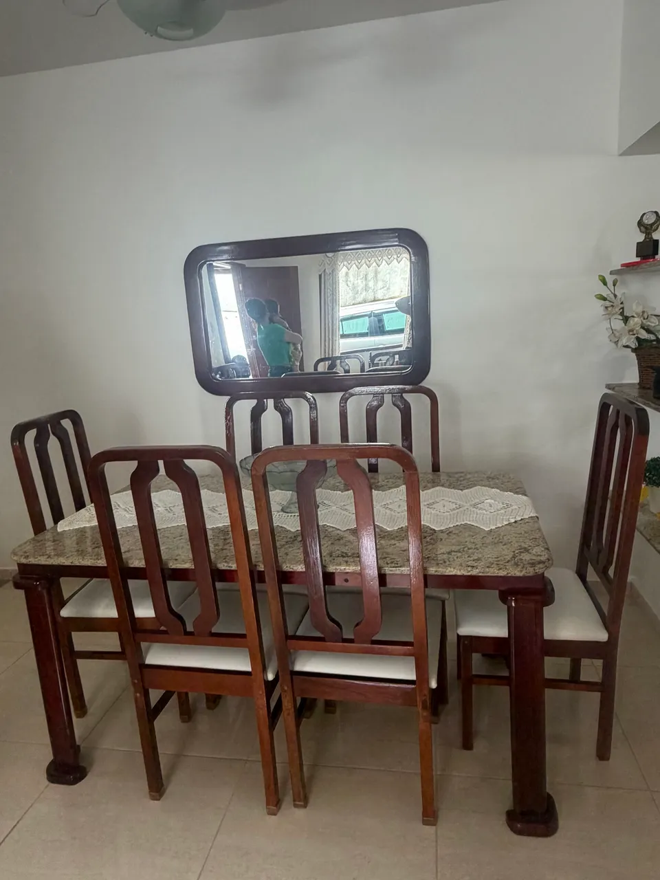Linda mesa de granito com 6 cadeiras de madeira, ideal para sua sala de jantar! Design clássico e elegante que combina com qualquer ambiente, proporcionando conforto e beleza.