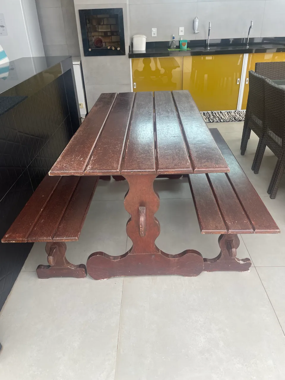 Mesa em madeira maciça, forte e conservada acompanhada de dois bancos longos, perfeita para áreas externas como churrasqueira, quintal, varanda, jardim e/ou piscina.