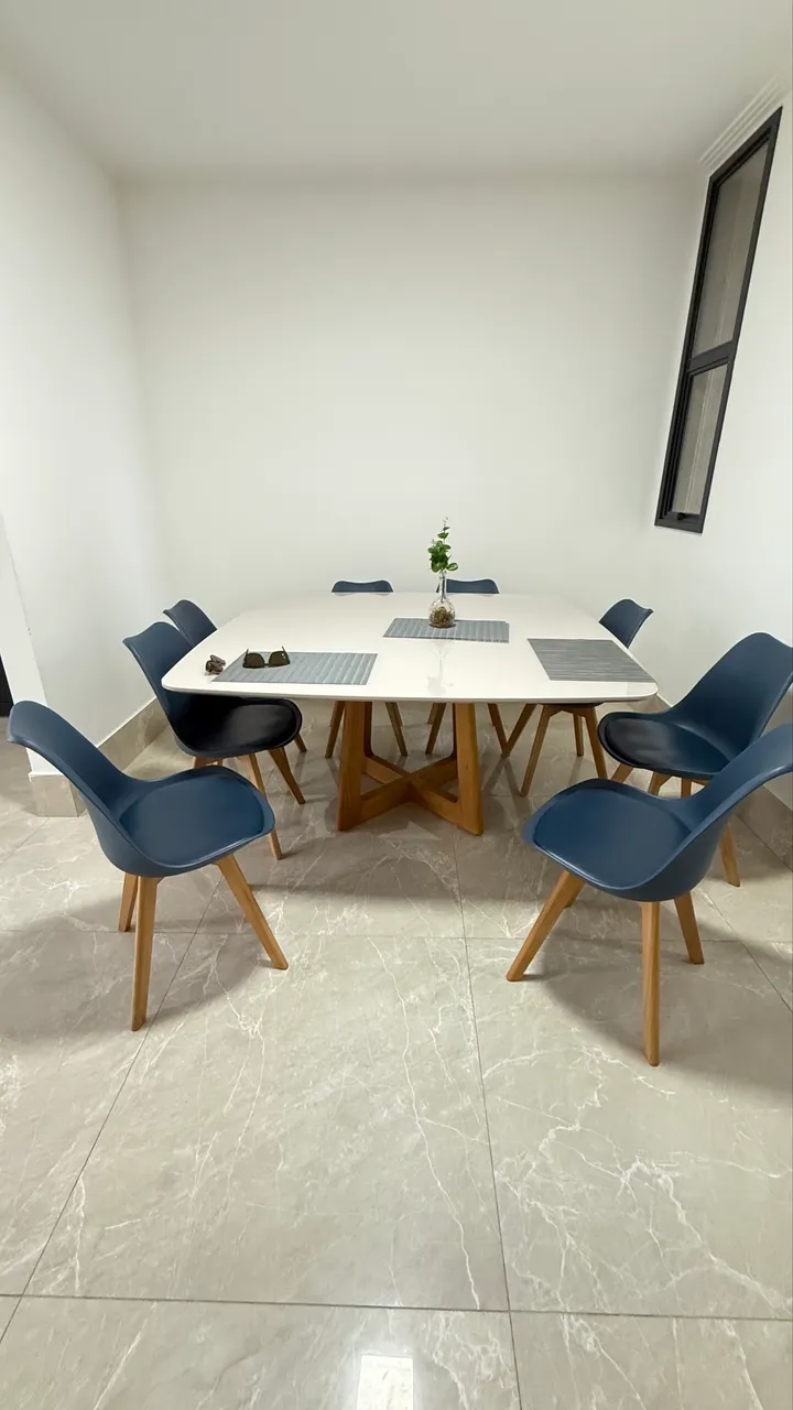 Linda mesa de jantar quadrada, ideal para compor sua sala de jantar. Design moderno e elegante, com acabamento impecável. Já vai com as oito cadeiras, sem detalhes e em perfeito estado de conservação.