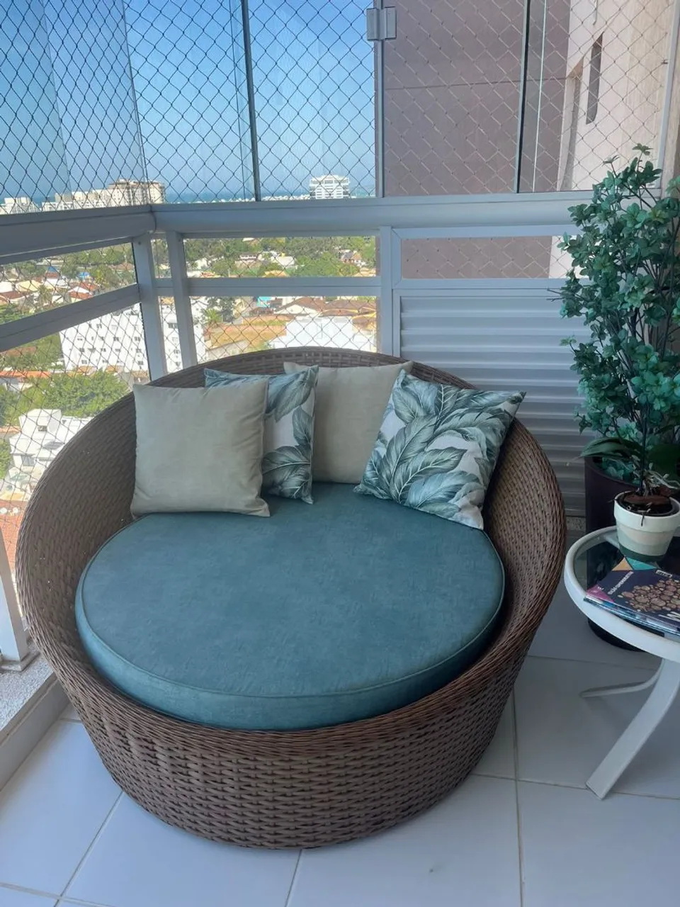 Linda chaise redonda para varanda ou área de lazer. Design moderno, com almofadas e assento confortável. Perfeita para relaxar e aproveitar momentos de descanso.