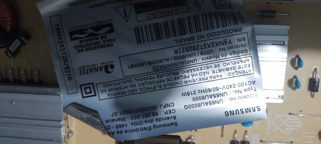 Placas da tv Samsung UN65AU8000G com resolução 4K, design elegante e diversas funcionalidades smart.