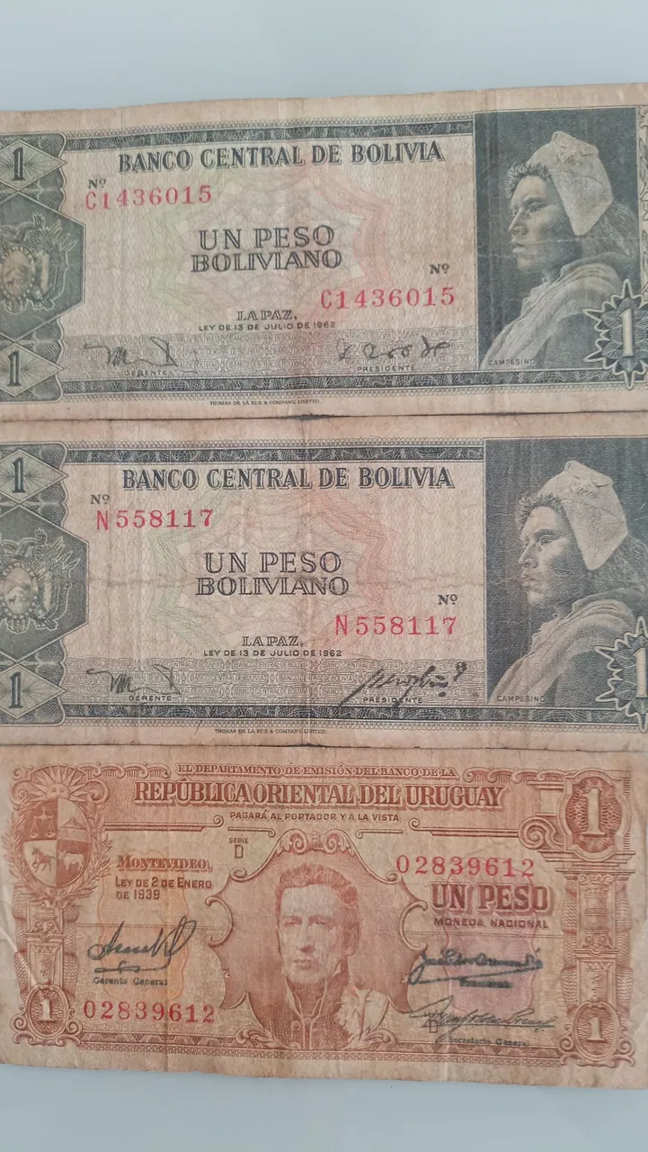 Cédulas antigas de 1 Peso Boliviano e 1 Peso Uruguaio, peças raras para colecionadores de antiguidades e amantes da história monetária. Uma oportunidade única de adquirir essas relíquias!