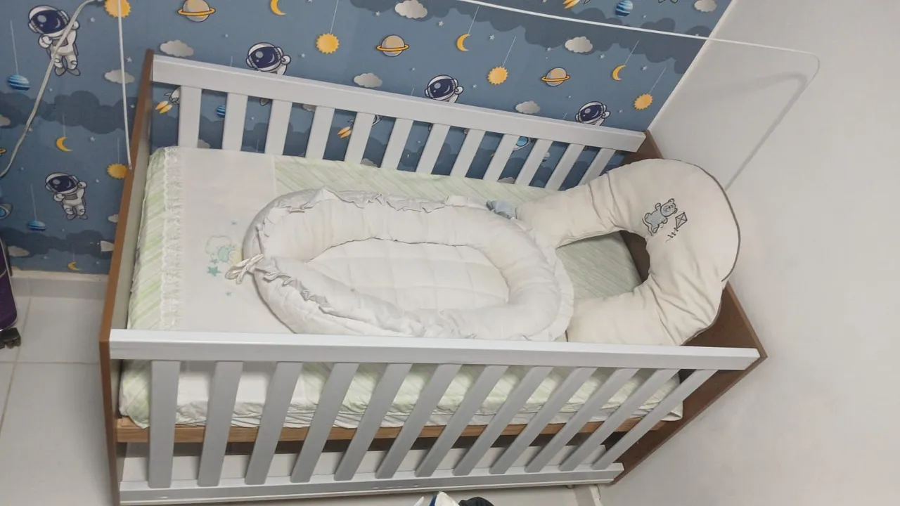 Berço acompanha uma almofada de amamentação, ninho para seu bebê além de mosqueteiro e lençol. Aceito cartão Interessados devem retirar em Benfica-RJ
