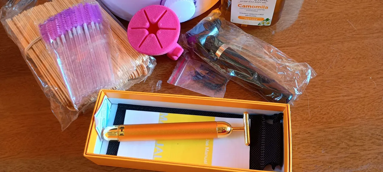 Kit de estética completo para você! Inclui massageador facial, produtos para depilação e para sombrancelha. Perfeito para realçar sua beleza e cuidados pessoais.