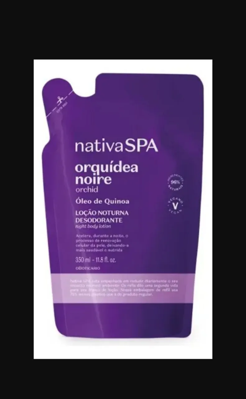 Desperte a beleza da sua pele com a Loção Noturna Desodorante Nativa SPA Orquídea Noire! Enriquecida com óleo de quinoa, esta loção acelera o processo de renovação celular durante a noite, deixando sua pele mais saudável e nutrida. Experimente a combinação perfeita de cuidado e perfumação!