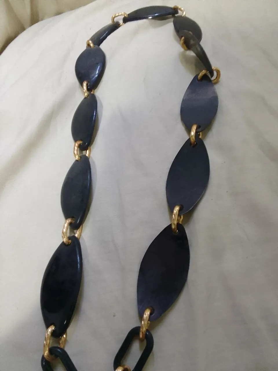 12_Lindo cinto preto com design moderno e sofisticado. Elos ovais em tom escuro com detalhes dourados, perfeito para complementar seu look.