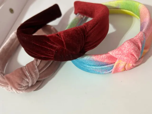Kit com 3 tiaras com nó, sendo duas de veludo e uma estampada. Conforto e estilo para seu dia a dia!