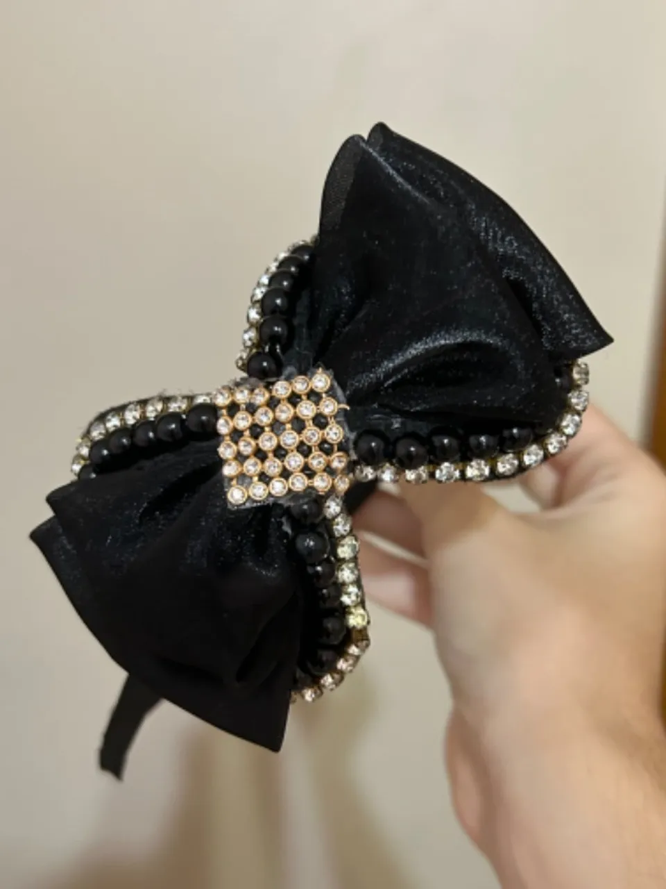 Linda tiara com laço preto elegante, perfeita para dar um toque especial ao seu visual. Detalhes em pedrarias que adicionam um brilho sutil e sofisticado. Ideal para diversas ocasiões!