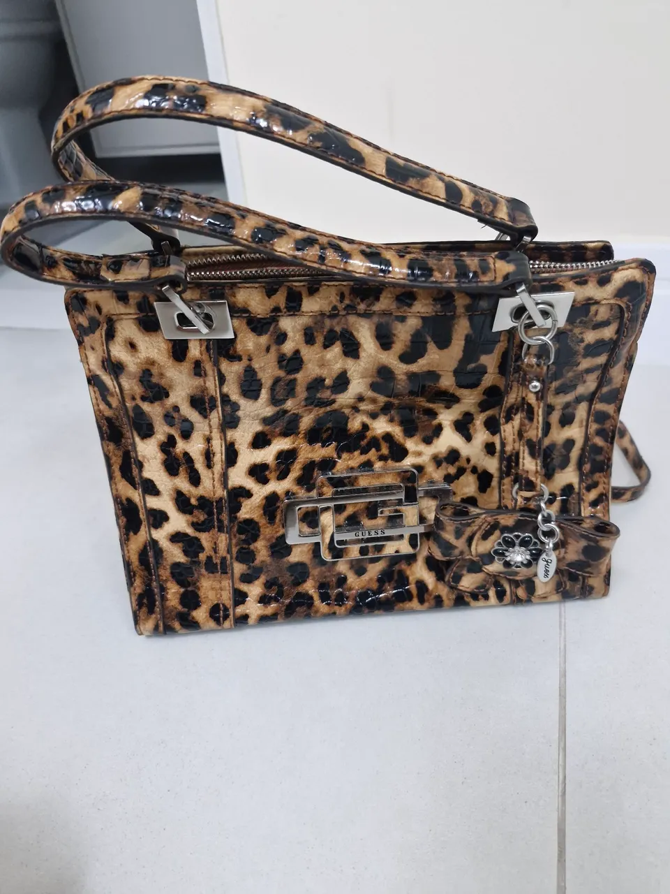 Linda bolsa Guess original com estampa animal print. Design moderno e elegante, perfeita para qualquer ocasião. Detalhes que a tornam única e sofisticada.
