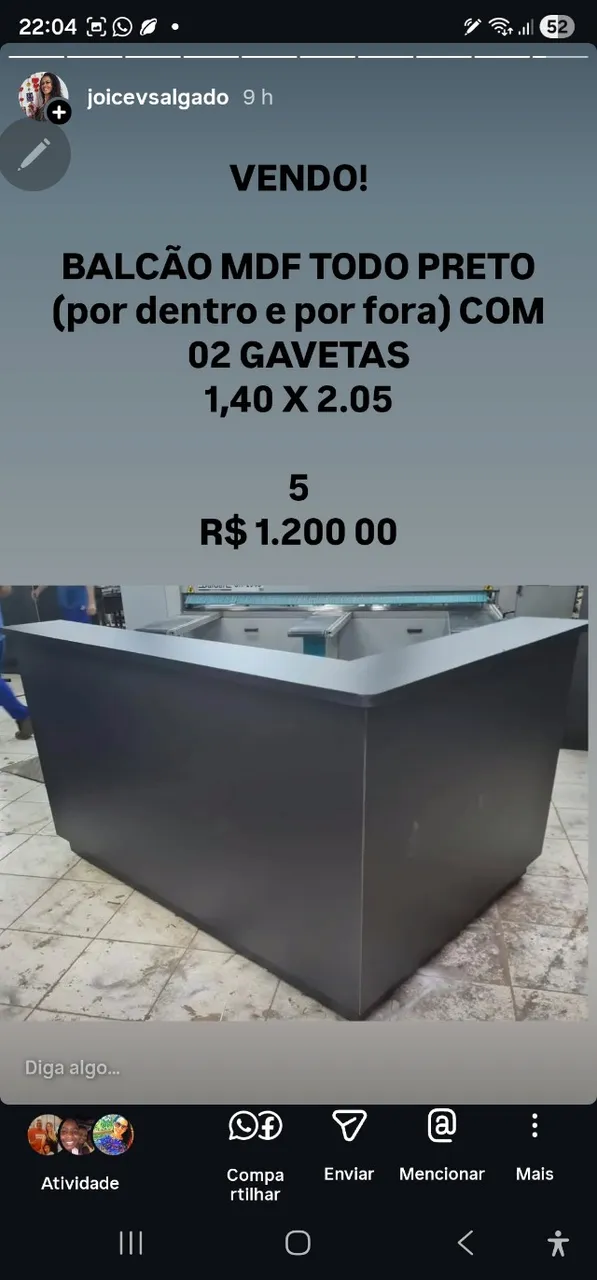 Lindo balcão em MDF preto, ideal para o seu comércio. Com 2 gavetas e design moderno, ele oferece praticidade e elegância para o seu espaço. Medidas: 1,40m x 2,05m. Adquira já! ACEITO OFERTA!