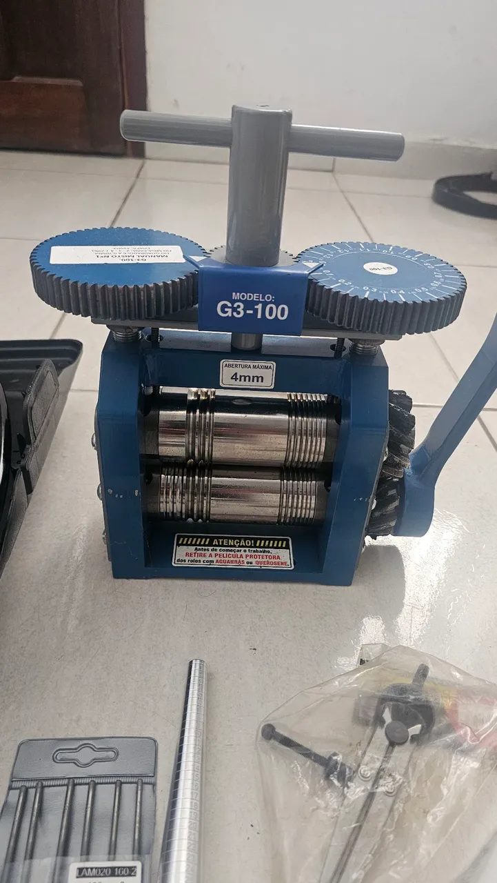 Ferramentas essenciais para ourivesaria, incluindo laminador modelo G3-100, ideal para trabalhos precisos e profissionais. Prepare-se para criar peças incríveis com este equipamento de alta qualidade.