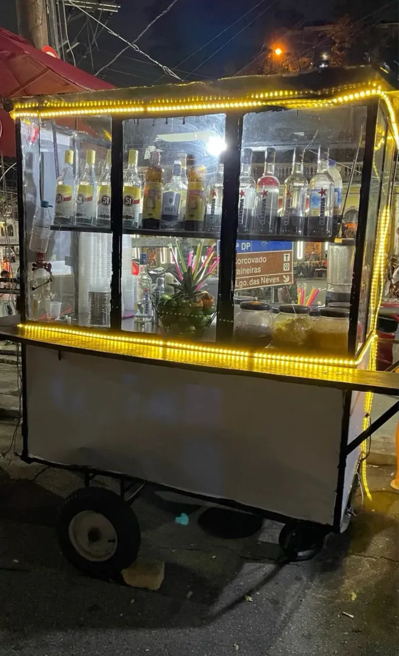 Vendo carrinho de caipirinha, ótimo estado de conservação. Bem espaçoso. Duas portas com um amplo espaço para guardar material e algo mais. Acompanha luz de led. Tem proteção para chuva e sol .