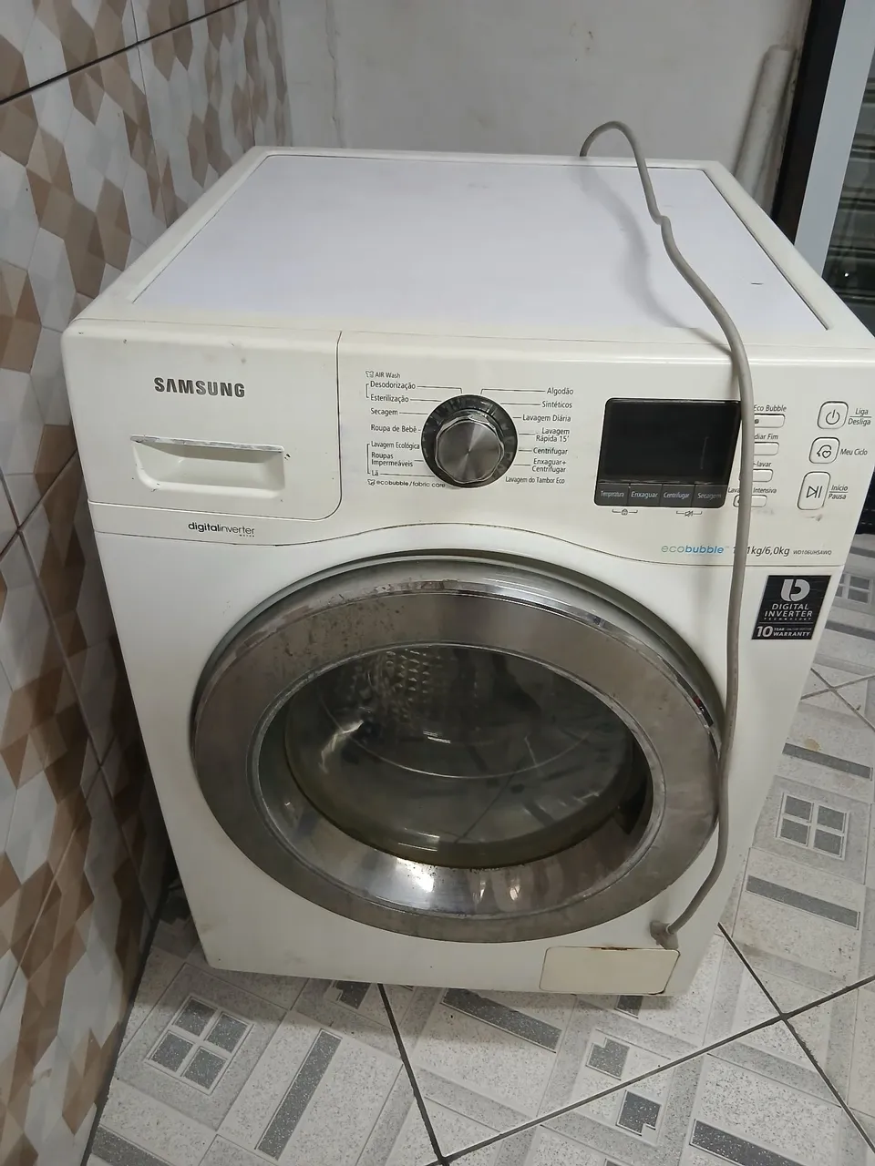 Máquina de lavar e secar Samsung com tecnologia digital inverter e ecobubble. Ideal para quem busca praticidade e eficiência na lavagem de roupas. Aparelho com defeito, ideal para conserto ou aproveitamento de peças.