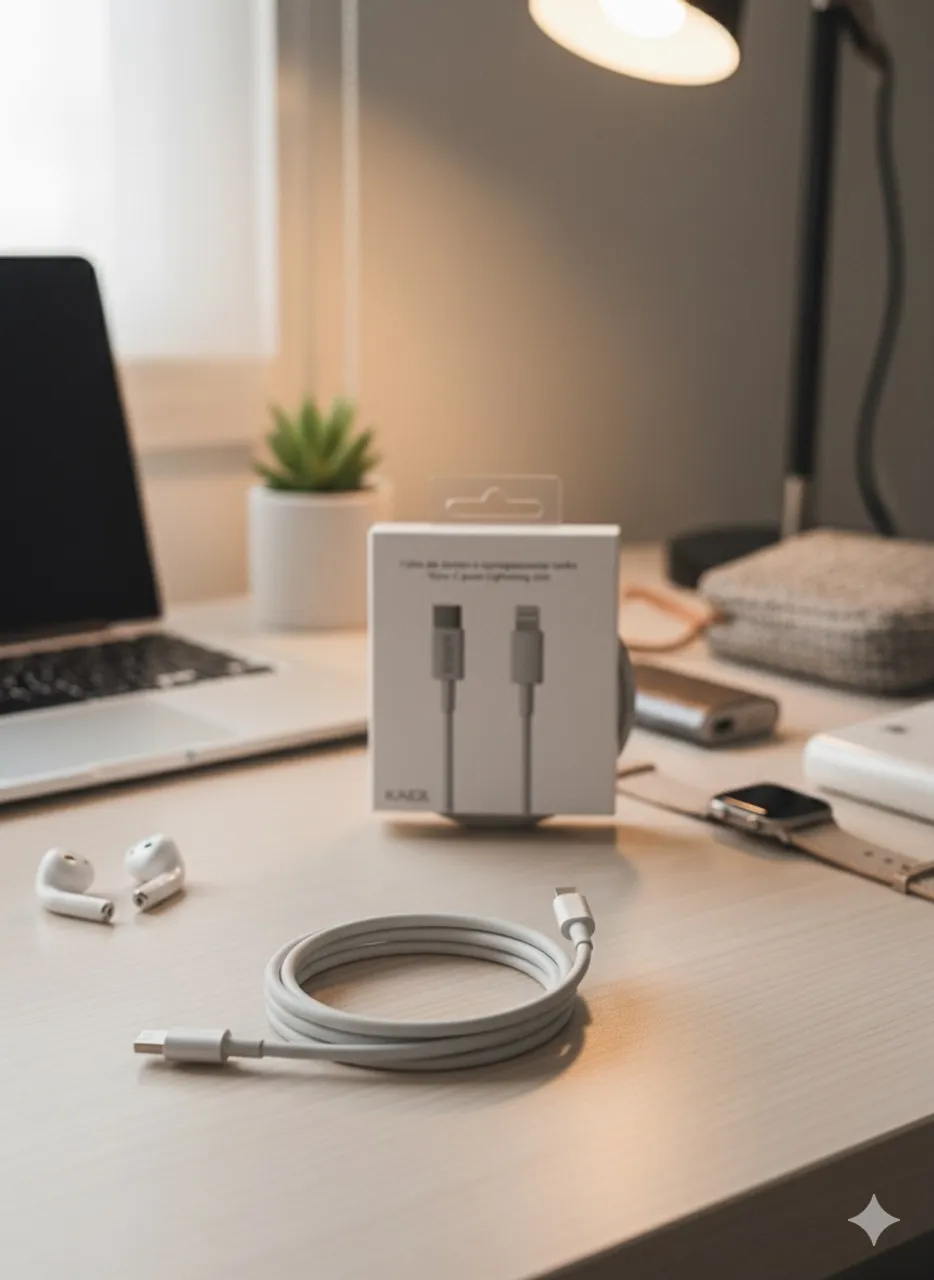 Cabo Kaidi USB-C para Lightning, ideal para carregar e sincronizar seus dispositivos Apple com rapidez e segurança.