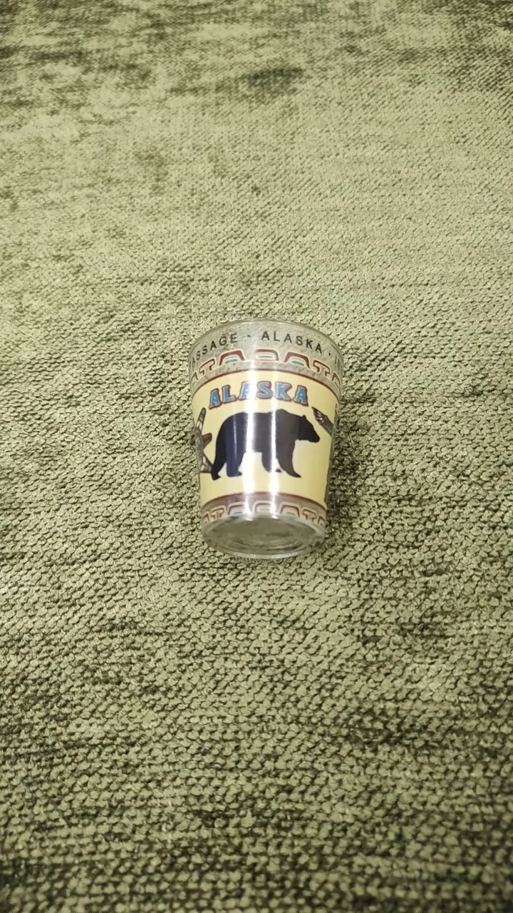 Mini copo de shot com estampa do urso e a palavra Alaska. Ideal para colecionadores.