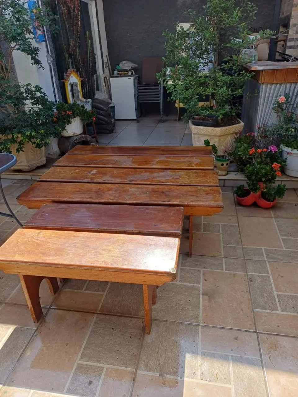 Conjunto de bancos de madeira, perfeito para áreas externas ou internas. Design rústico e resistente, ideal para criar um ambiente acolhedor e charmoso.