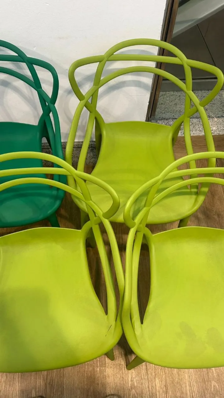 Cadeiras modernas e vibrantes em polipropileno para dar um toque especial ao seu ambiente. Design arrojado e cores verdes que combinam com qualquer decoração.