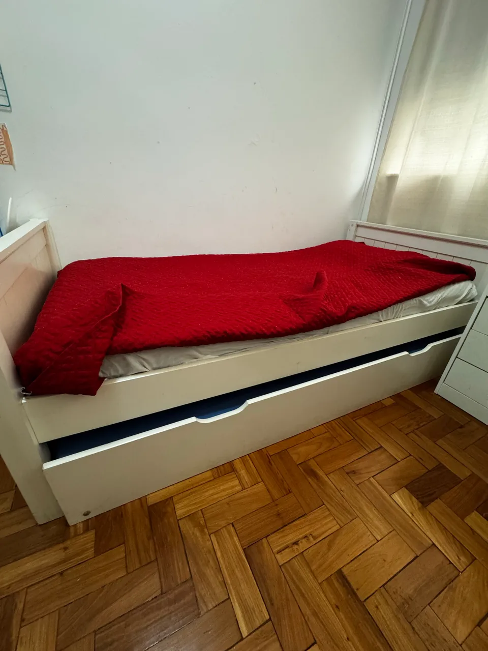 Cama branca medindo 2,02cm x 1,00cm em madeira. Pode ou não incluir colchões, à combinar. Retirada em Copacabana por conta do comprador. Usada mas em bom estado de conservação pela qualidade da madeira. Precisa ser desmontada para retirada.