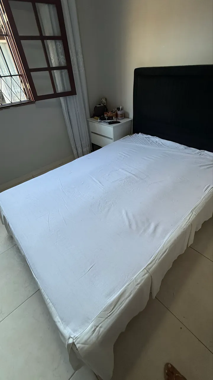 Cama com cabeceira elegante, perfeita para um quarto moderno. Colchão está razoável e o box está ótimo é de madeira maciça e possui 2 gavetões . O tamanho dessa cama foi feito sob medida ela tem 1,38 de largura por 1,98 de comprimento porem e so usar lençol tamanho queen! A cabeceira e tamanho 1,38 é preta de tecido veludo e pés de madeira