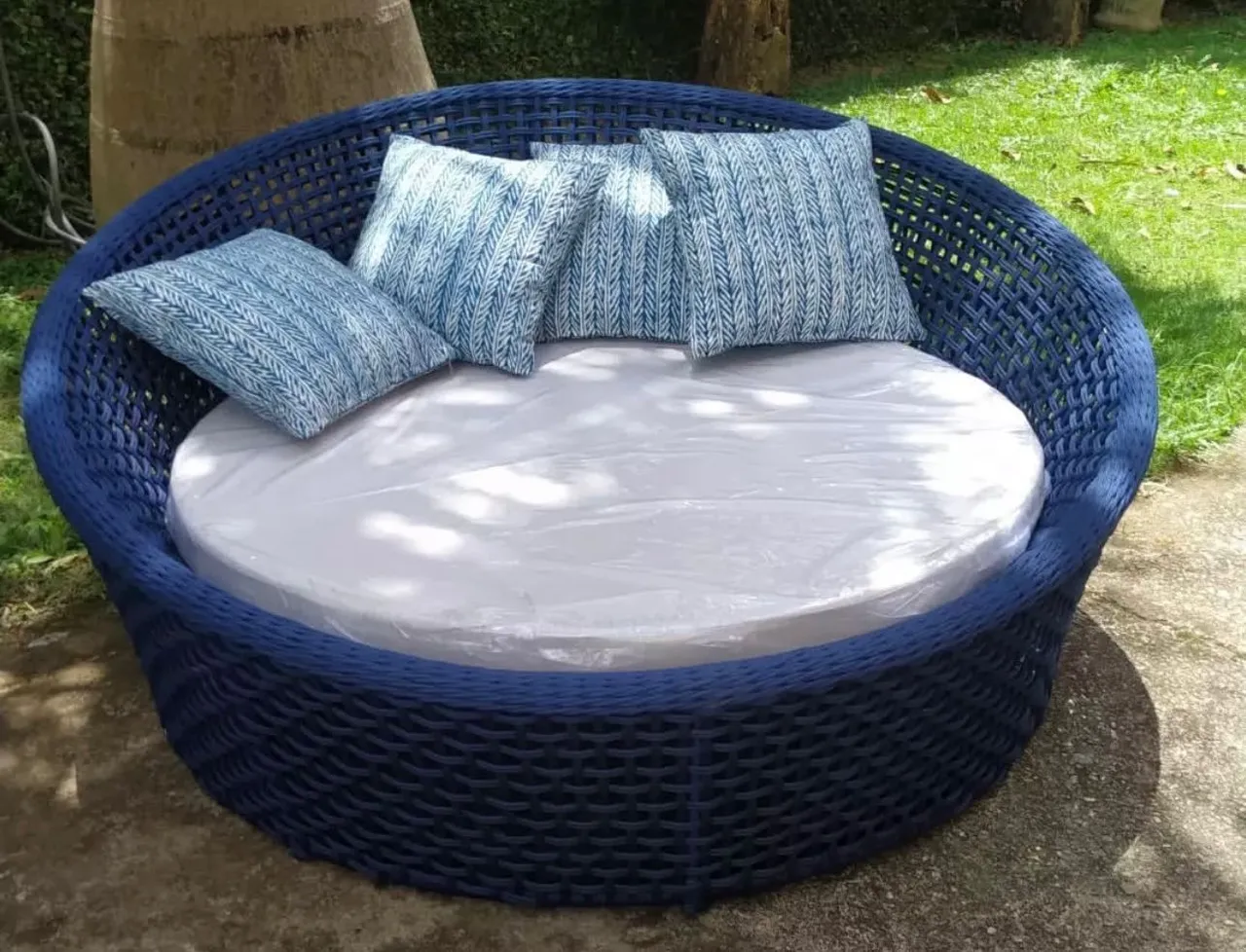 Desfrute de conforto e estilo com esta elegante cama redonda de vime azul. Perfeita para relaxar ao ar livre, esta peça combina design moderno com durabilidade.