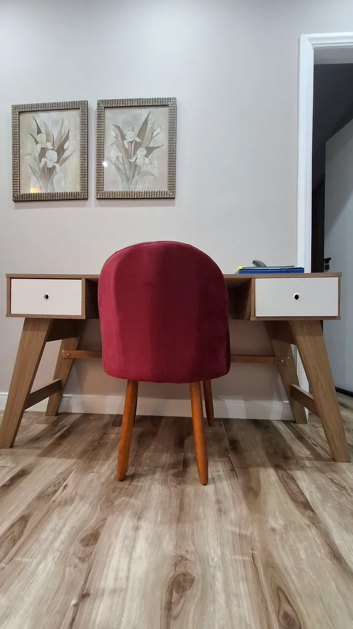 Escrivaninha com duas gavetas com cadeira estofada, em suede bordô. Tudo em ótimo estado.