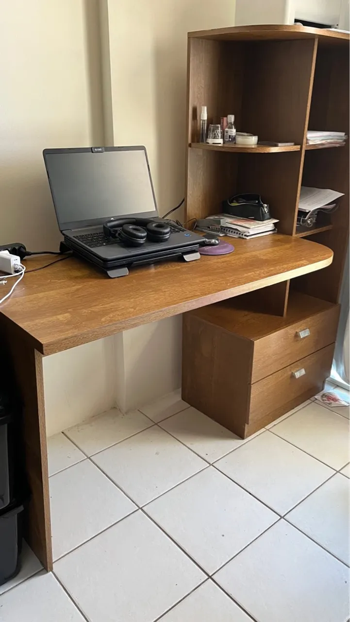 Linda escrivaninha com design moderno e funcional. Perfeita para organizar seu espaço de trabalho ou estudo com estilo e praticidade. Possui espaço para computador, gavetas e prateleiras.
