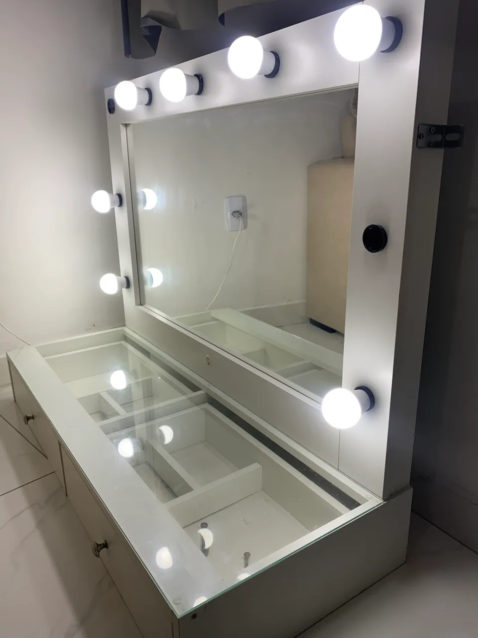 Penteadeira em ótimo estado, com espelho grande e iluminação estilo camarim. Possui gavetas espaçosas com divisórias e tampa de vidro, ideal para organizar maquiagens e acessórios.