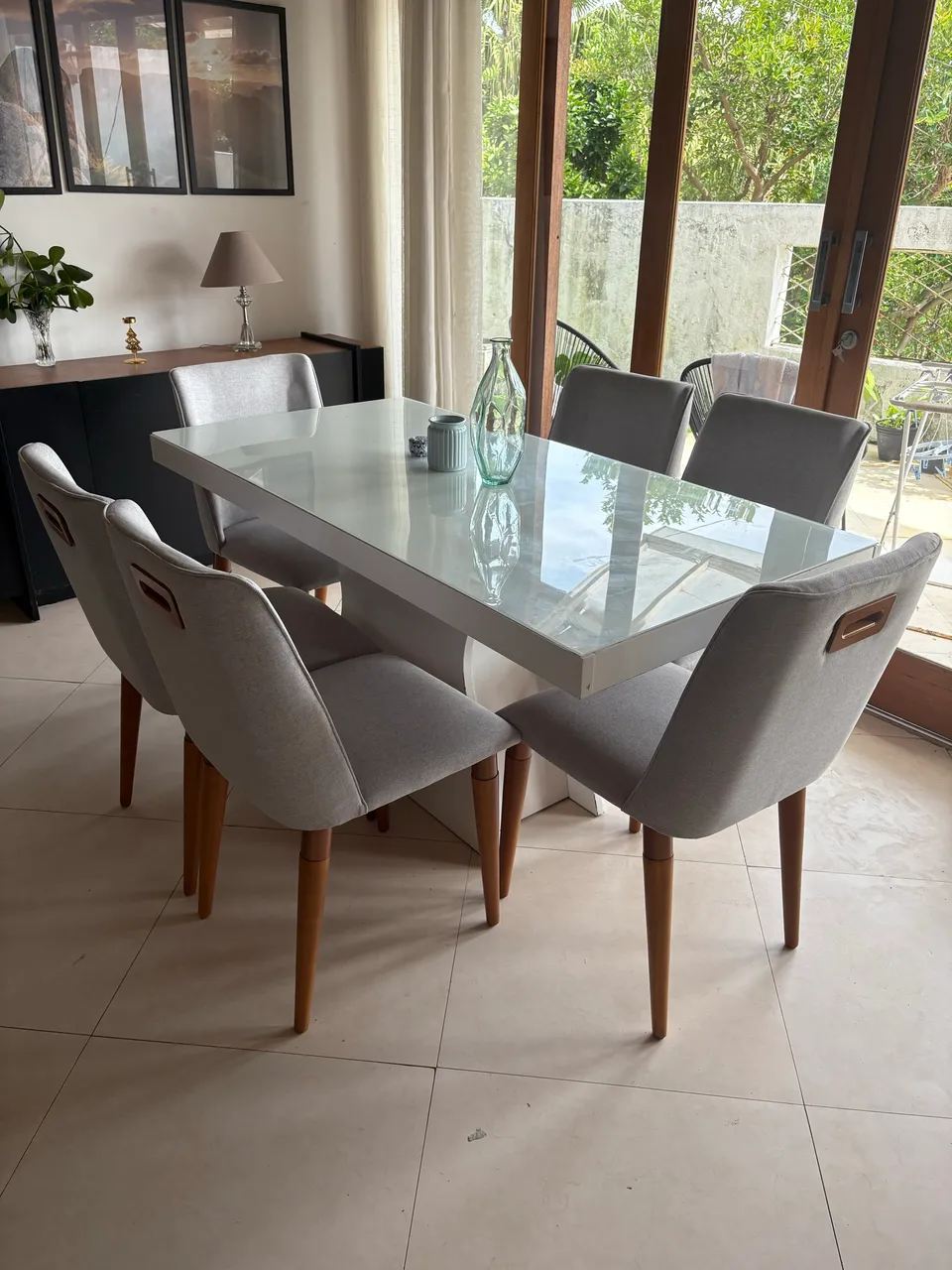 Cadeiras novíssimas e em perfeito estado. Mesa de jantar com algumas imperfeições na parte de baixo.