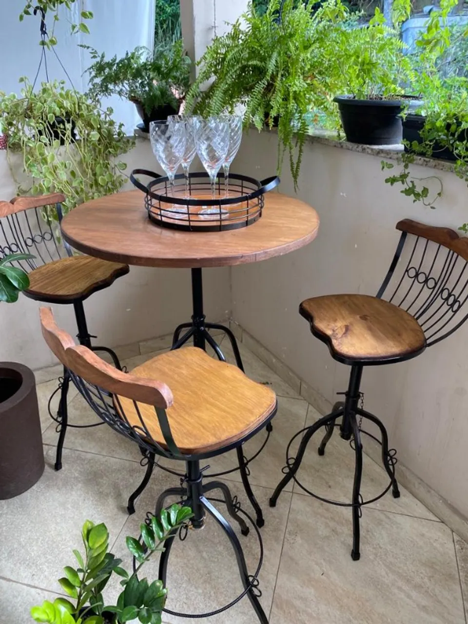 Lindo conjunto de mesa redonda com cadeiras rústicas, ideal para sua varanda, cozinha ou área de lazer. Perfeito para criar um ambiente charmoso e convidativo. Design elegante e confortável, ideal para desfrutar de momentos de relaxamento. Tamanho da mesa 70cm, altura ajustável e giratória, fica baixa e alta (bistrô)