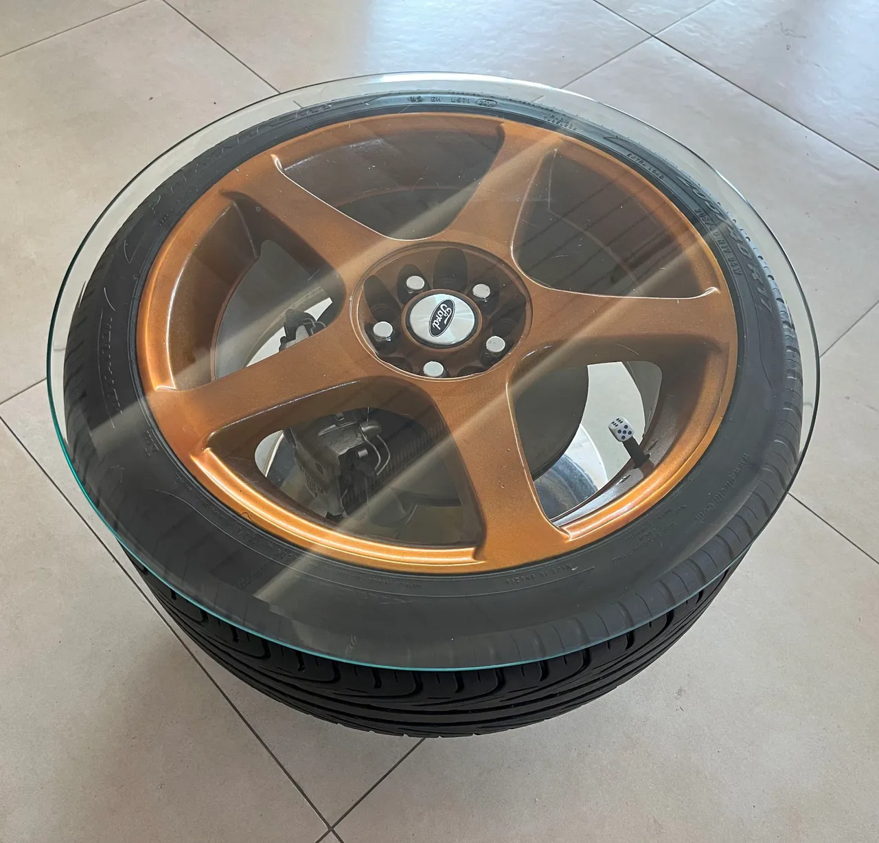 Linda mesa de centro com design exclusivo, feita com roda de carro e tampo de vidro completa com disco e pinça de freio. Iluminação em LED verde a bateria. Uma peça que combina estilo e personalidade para sua sala, escritório, oficina.