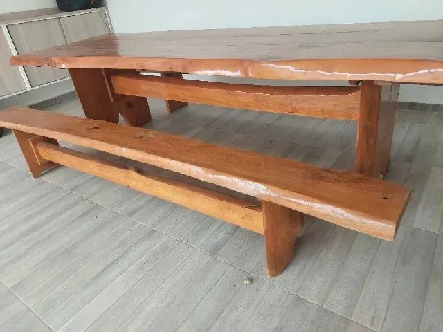Linda mesa de jantar rústica em madeira maciça, com design elegante e charmoso. Acompanha um banco para acomodar confortavelmente seus convidados. Ideal para criar um ambiente acolhedor e sofisticado. WhatsApp: