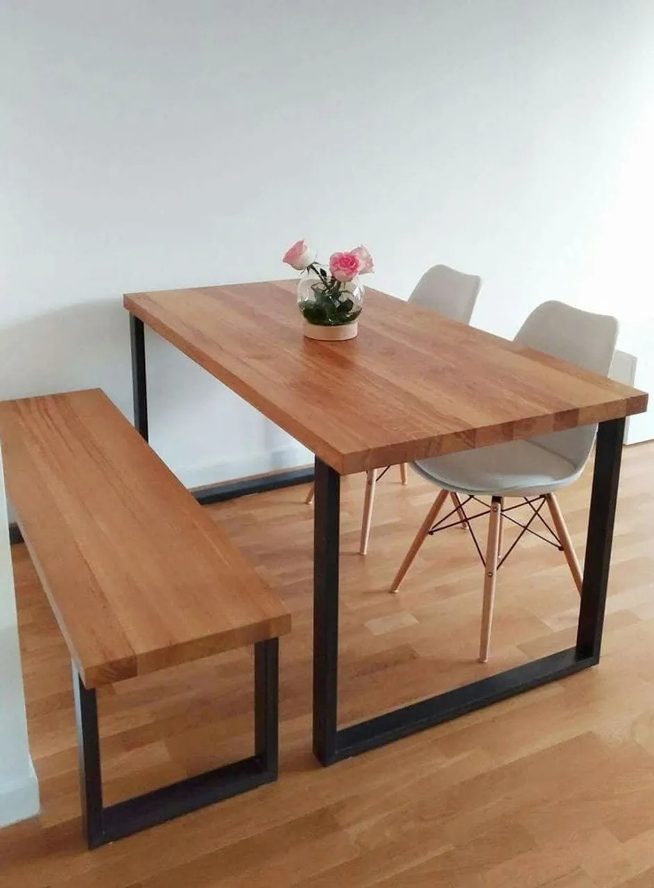 Conjunto de mesa de jantar com design industrial, tampo de madeira maciça e estrutura em metal preto. Acompanha um banco para complementar o ambiente. WhatsApp: