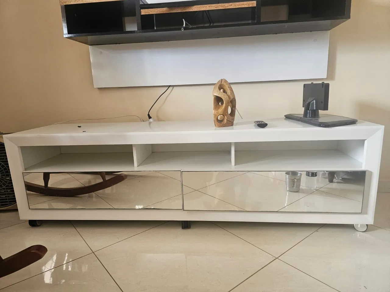 Lindo rack branco, perfeito para sua sala! Design moderno e elegante, ideal para organizar sua TV e seus aparelhos eletrônicos. Aproveite!