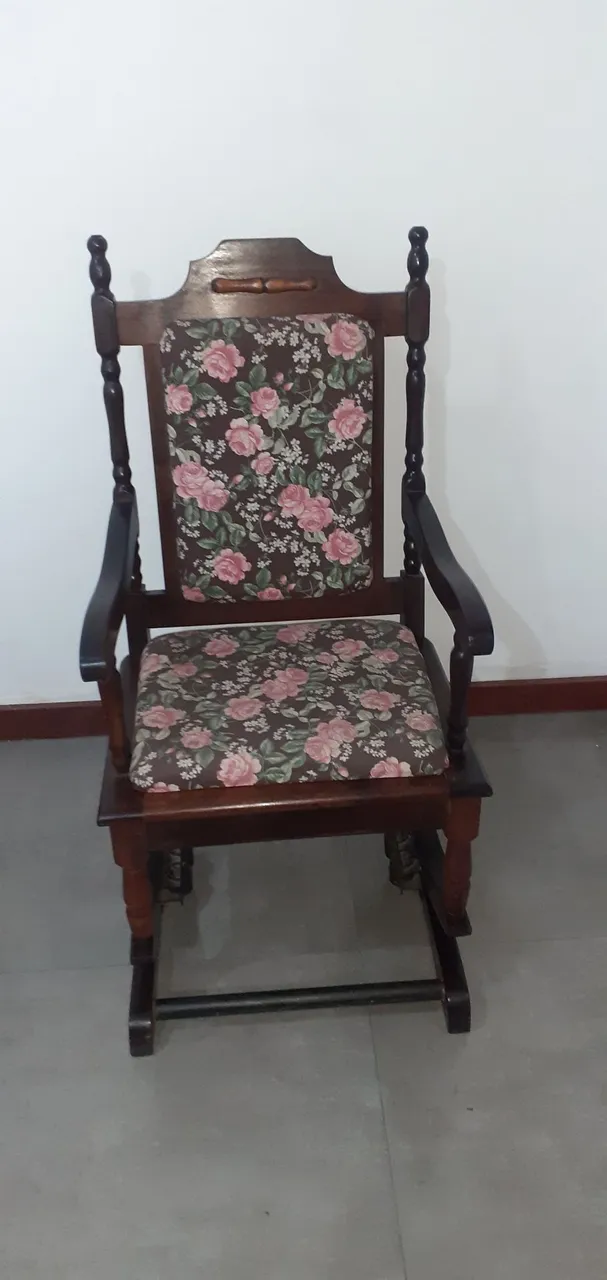 Antiga cadeira de balanço, conhecida como cadeira de amamentação. Toda em madeira com tecido em floral em ótimas condições, o assunto devido ao tempo está um pouquinho desbotado. Madeira em perfeitas condições e as molas com boa tensão. Pode ser posta como decoração em quarto, escritório, sala ou varanda.