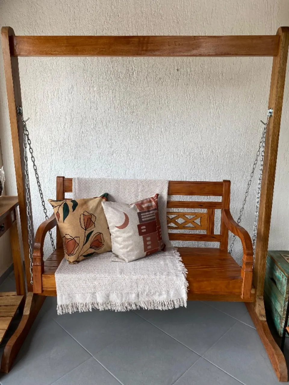 Desfrute de momentos relaxantes com este balanço de madeira artesanal! Design elegante e confortável, perfeito para sua varanda ou área de lazer. Inclui almofadas para maior conforto e estilo.