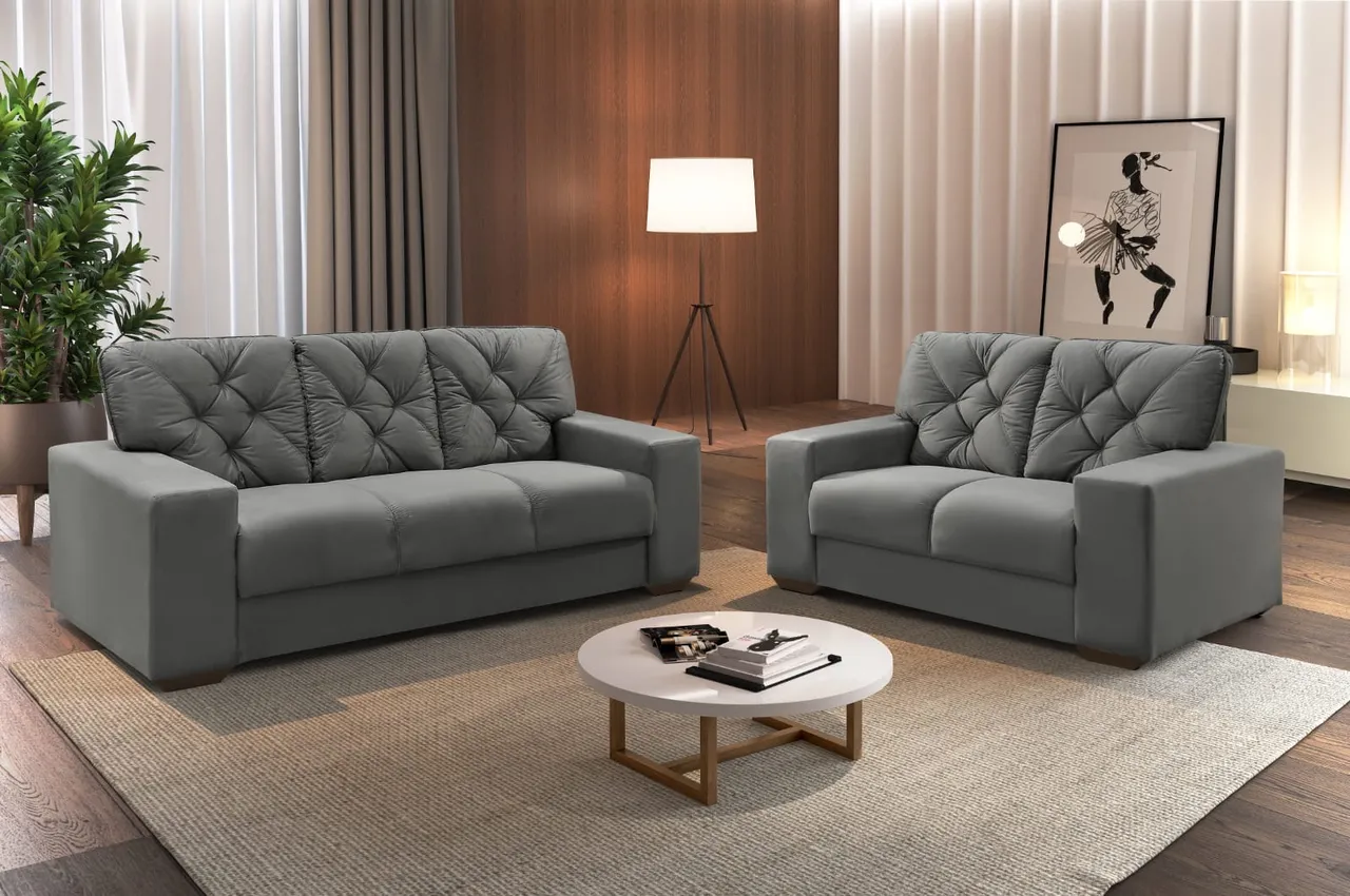 com Assentos em Espuma Selada D33, Molas ¨S¨ , Encosto e Braços de Flocos Espuma e Fibra de Poliéster Siliconado e Pés de Madeira Maciça.