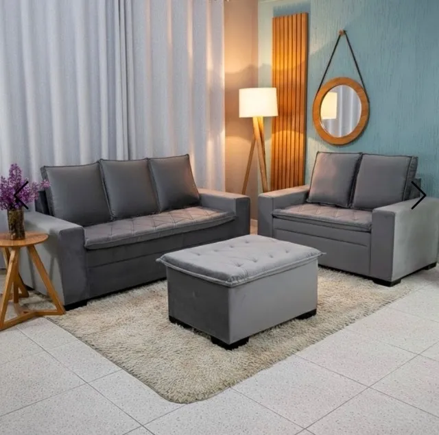 Conjunto de Sofás Lyon 3 e 2 Lugares com Puff Veludo Cinza 1,86m