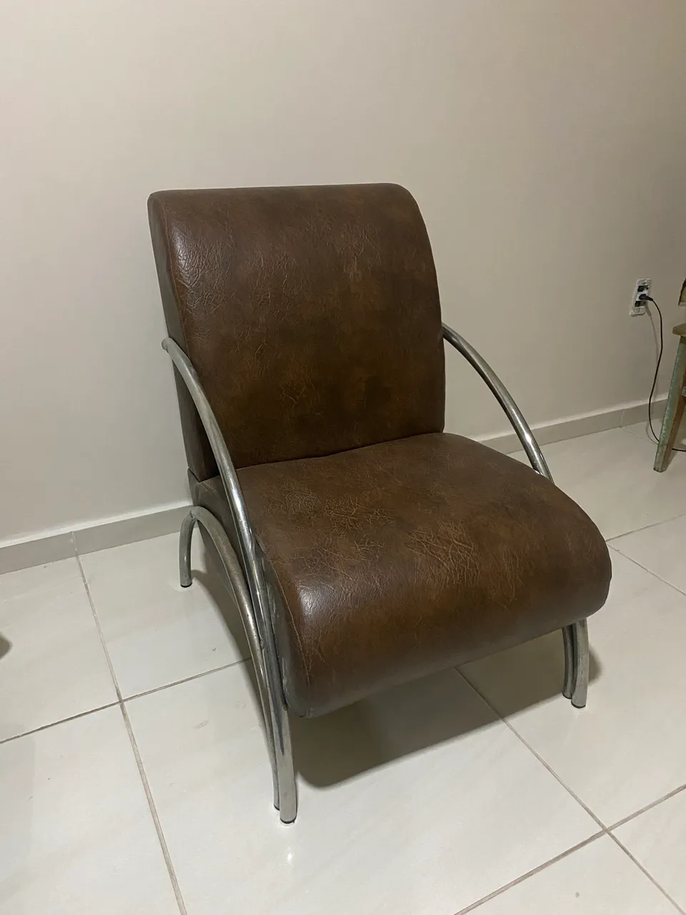 Linda poltrona com design elegante e confortável, perfeita para relaxar em sua sala de estar. Seu estofamento em tom marrom e a estrutura em metal cromado agregam sofisticação e durabilidade ao ambiente.