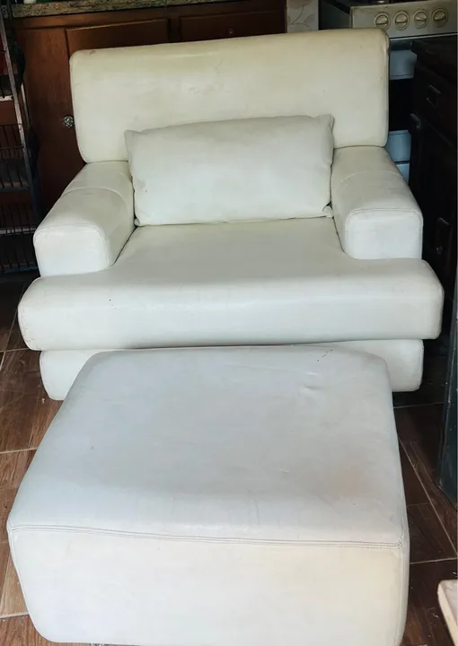 poltrona de couro branco com puff em ótimo estado, ideal para complementar a decoração da sua sala ou escritório. Possui estrutura resistente e revestimento macio, proporcionando conforto e estilo obs um perno rasgo atrás mas foi colado zap 21 ... ver número entrego