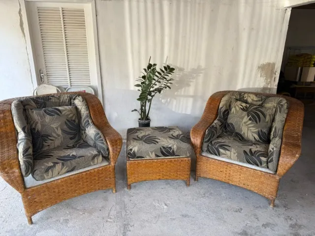 Jogo de duas poltronas de material rattan com almofadas e um apoio de pé.