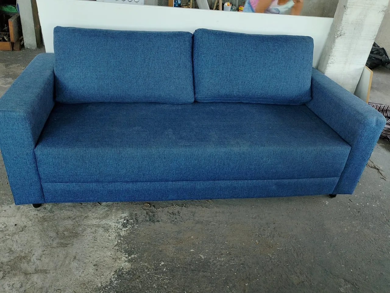 Sofá moderno e confortável na cor azul. Perfeito para relaxar e decorar sua sala de estar com estilo e elegância.