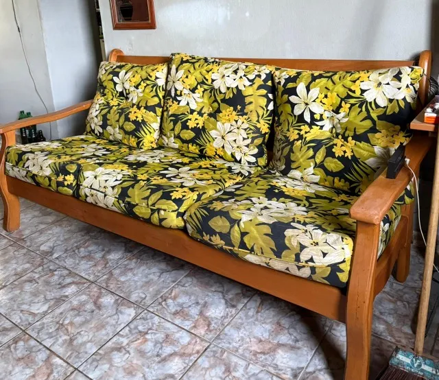 Sofá de madeira com design clássico e almofadas florais vibrantes, perfeito para adicionar um toque de charme e conforto à sua sala de estar.