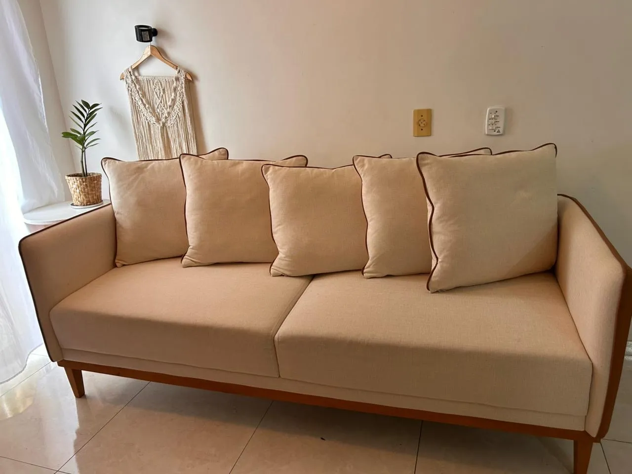 Sofá elegante em linho com detalhes em couro, ideal para dar um toque de sofisticação e conforto à sua sala de estar.