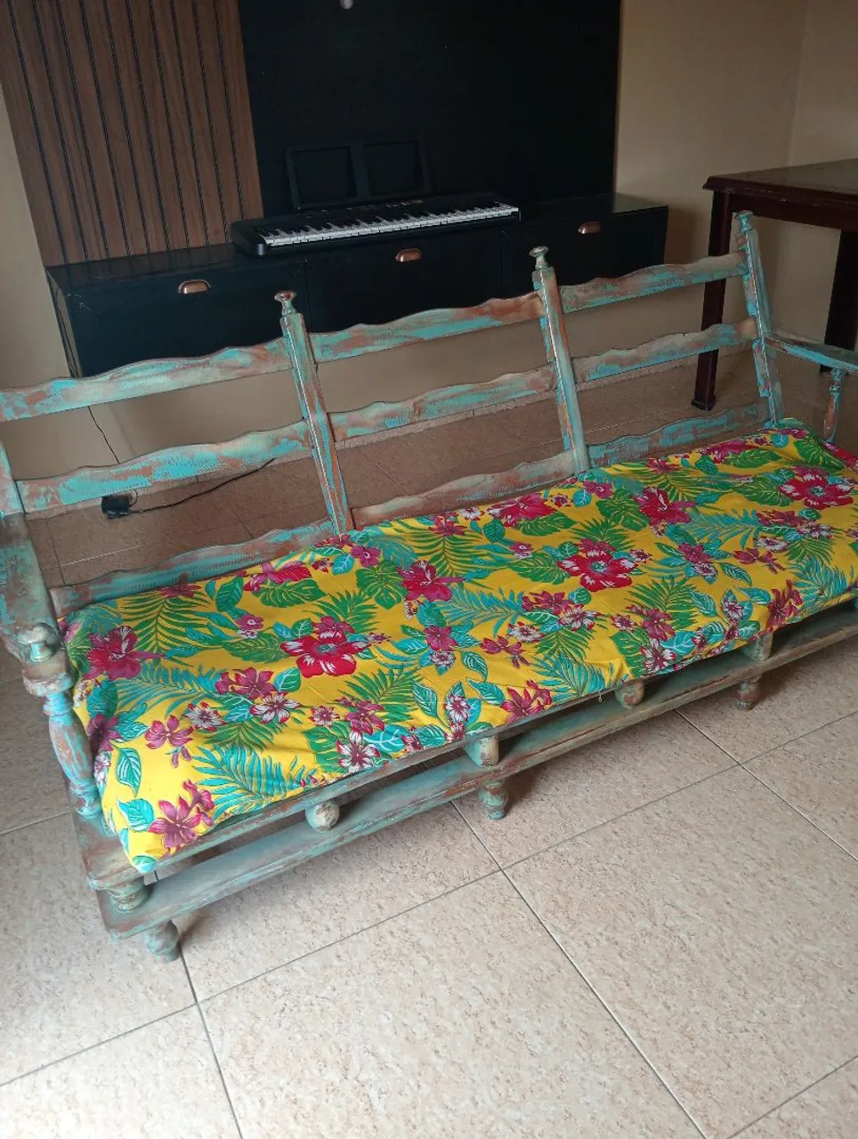 Sofá rústico de madeira, perfeito para dar um toque especial à sua casa. Design charmoso e confortável para relaxar e receber visitas.