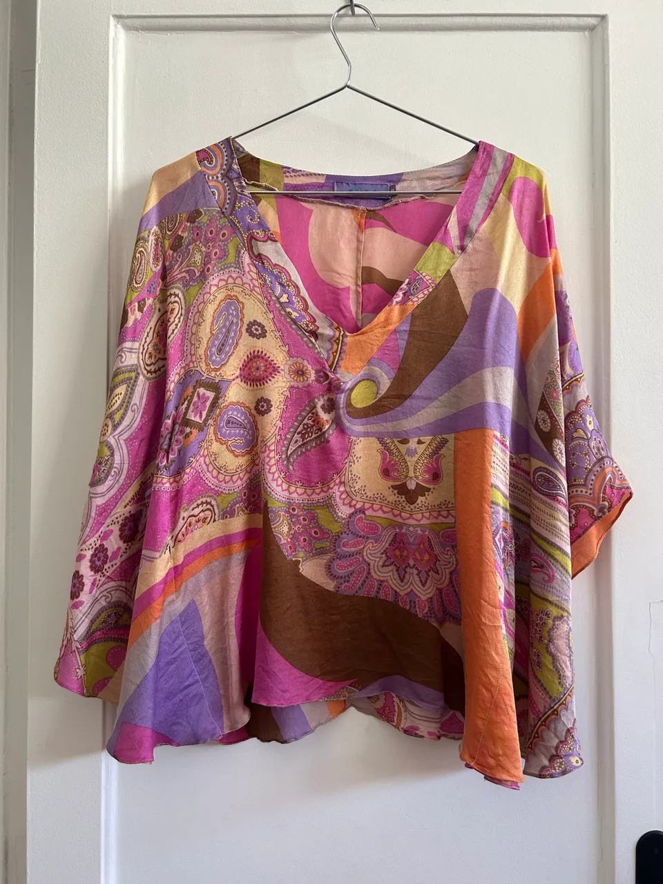 Bata estampada. Está sem etiqueta, mas o toque parece uma seda com elastano, porque estica de leve Tam. P