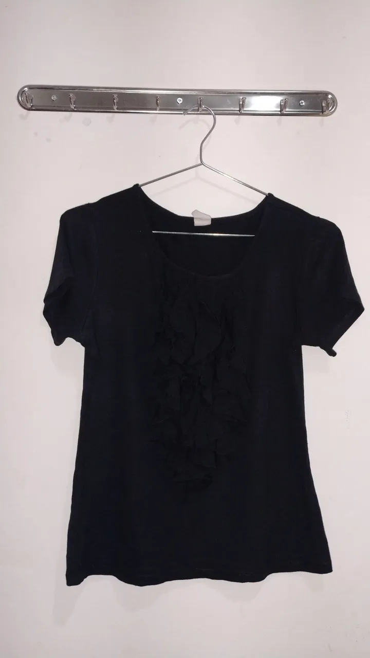 Blusa feminina preta, com detalhes charmosos na parte frontal. Ideal para diversas ocasiões, combine com diferentes peças e crie looks incríveis.